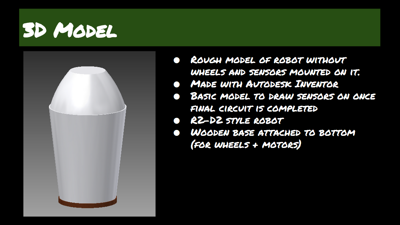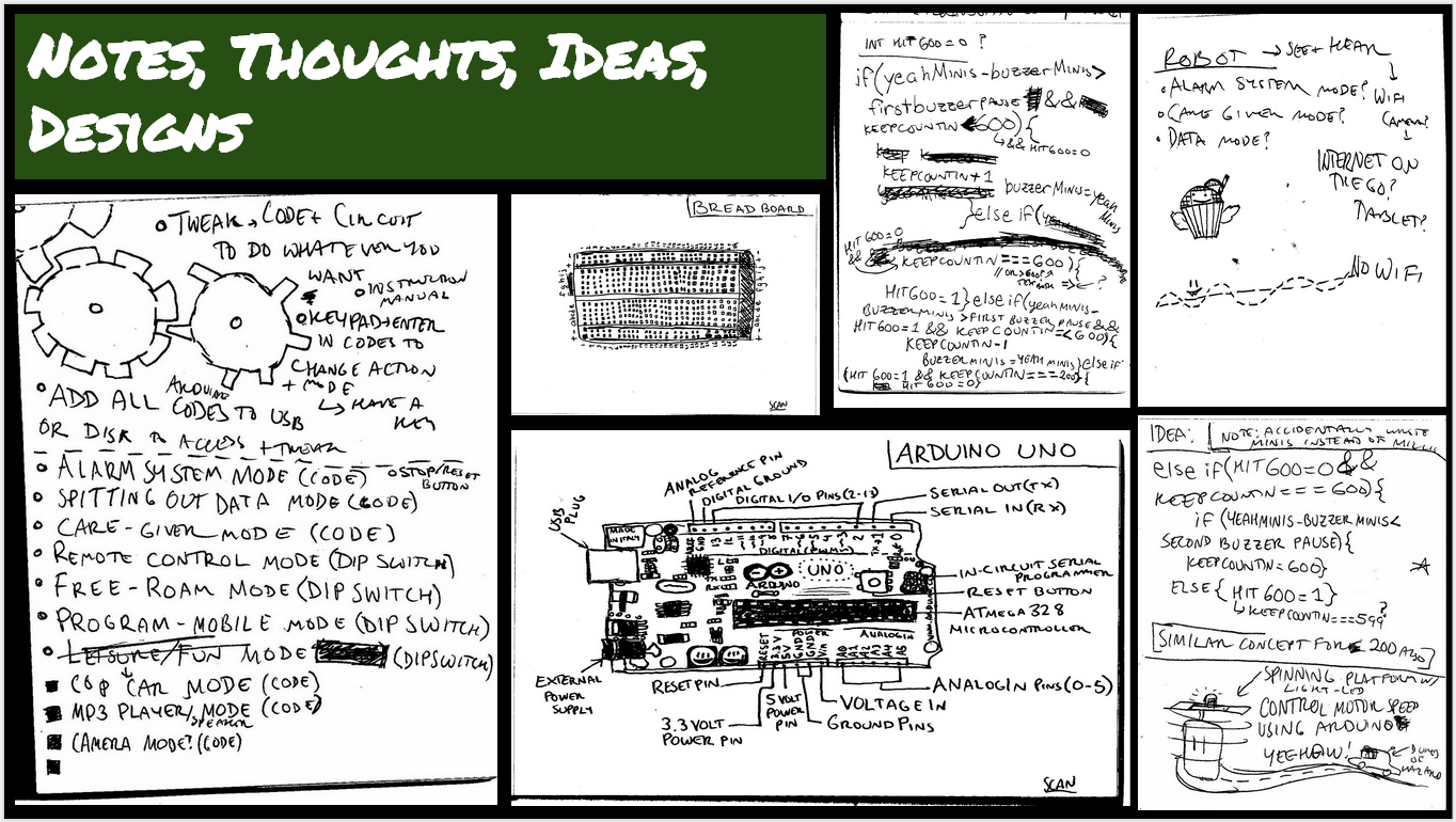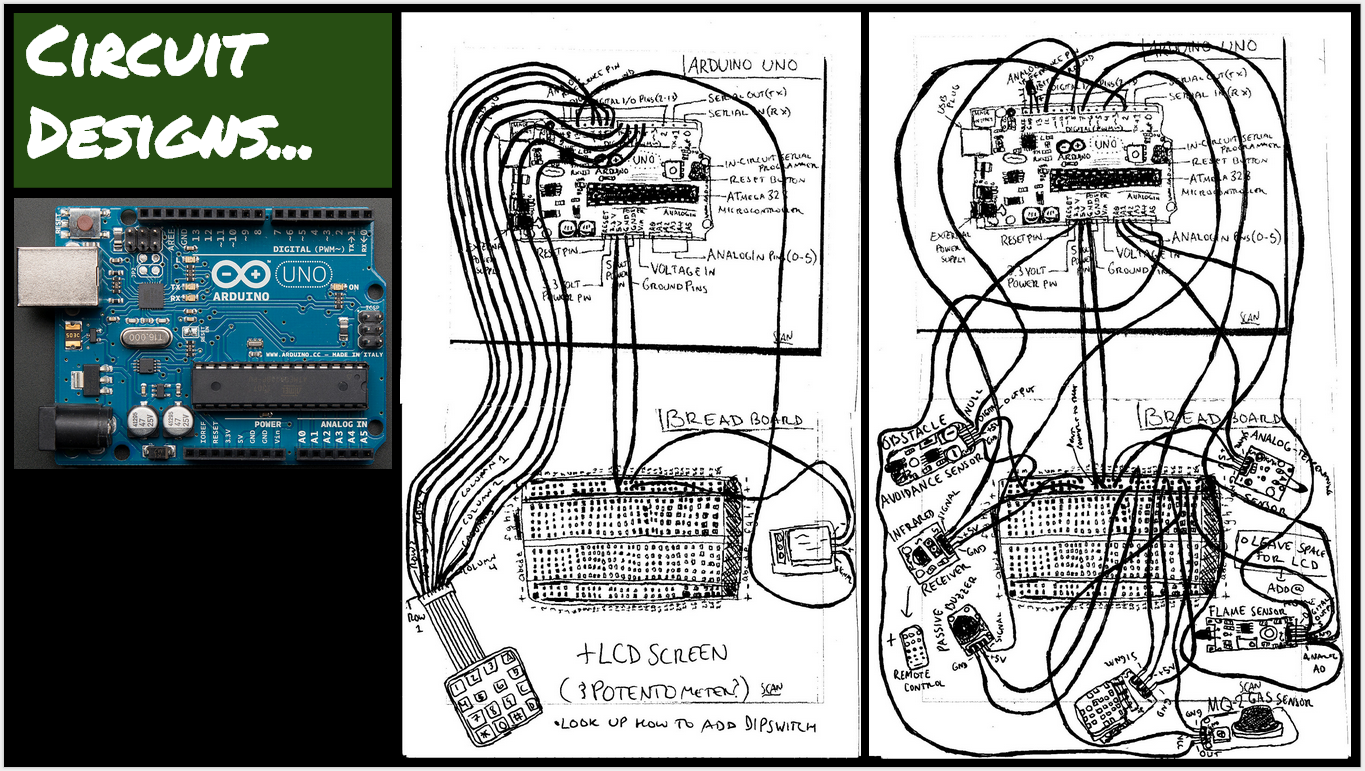 First, I Created A Rough 3D Model Of My Robot. The original design of the robot consists of a white trash can with a white bowl on top so that it could look like R2-D2. The Arduino board is easily accessible from under the lid so that you can edit/change the circuit and reprogram the robot. _____________________________________________________________________________________________ After Some Practice Programming, I Started Working On Some Of The Final Circuit Designs. Here are some of the earlier final circuit designs that I worked on. I ended up sort of combining the two and I added/subtracted certain sensors and components. Please note that the circuit designs do not include the battery, motors, or 8 channel relay. I also didn't add the Liquid Crystal Display to the design either, however I added a note about it. _____________________________________________________________________________________________ Here are some of my Notes, Thoughts, Ideas, and Designs for my robot and its circuit. |